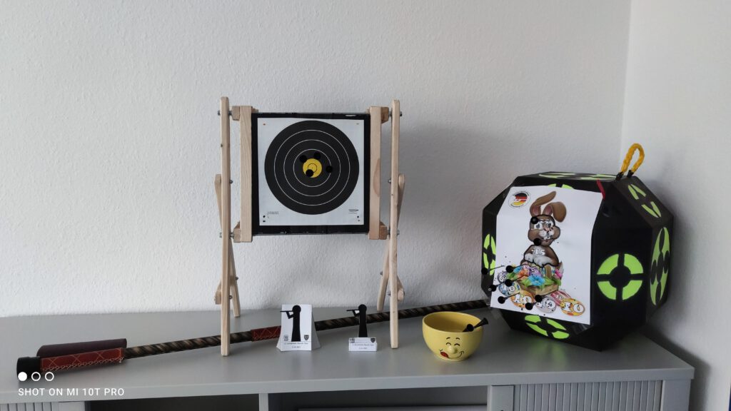 Das Blasrohrschiessen ist ein unkomplizierter Sport. Es reicht ein wenig Platz um sich eine kleine Schießbahn zu bauen. Oder man kann sich im Garten auch einen kleinen 3D-Parcours einrichten.
